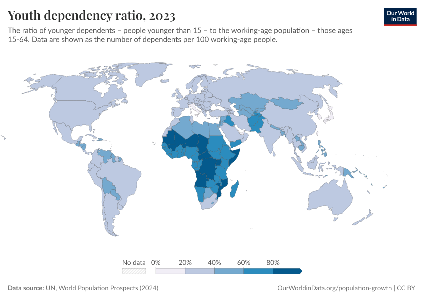 The young dependency ratio is high across Sub-Saharan Africa in particular. Some countries in this region have close to the same number of young people as they have working-age population. The youth dependency ratio is much lower across higher-income countries since fertility rates tend to be much lower there.