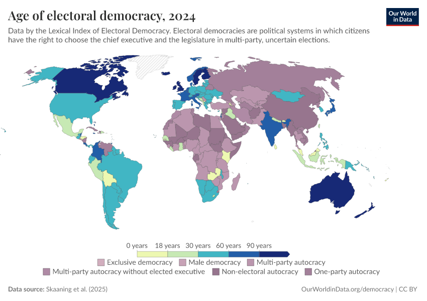 The interactive map shows how old electoral democracy was in each country in 2024 when using the RoW classification. The bar chart sums up the number of countries by age.