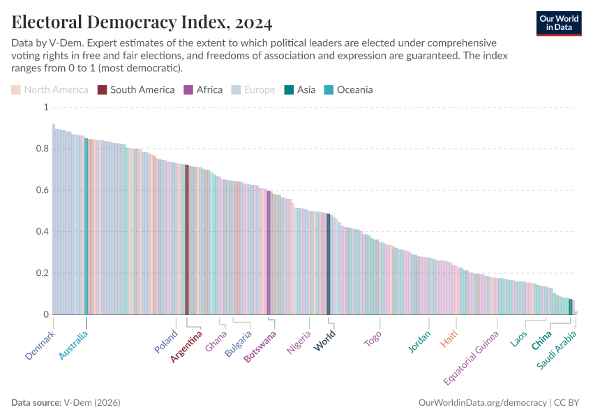 This explorer seeks to make data on democracy easier to access and understand. It provides and explains data from seven leading democracy datasets: their main democracy measures, indicators of specific characteristics, and global and regional overviews. You can learn more about the approaches — and which democracy measure may be best to answer your questions — in our article explaining how researchers measure democracy: