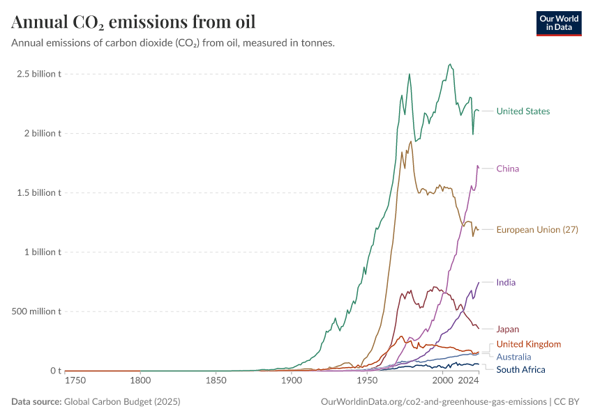 This interactive chart shows annual emissions from oil by country, over time.