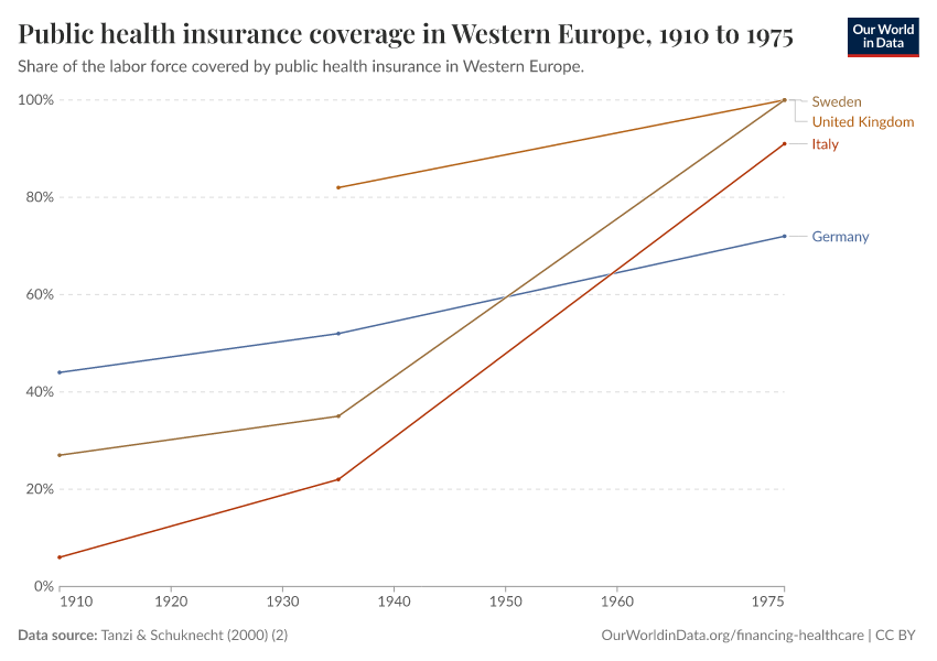 The visualization presents public health insurance coverage as a percentage of the labor force for a number of European countries. Tanzi and Schuknecht (2000) – the source for the data in this figure – note that by 1929 all the eleven European countries shown in this visualization had at least voluntary insurance schemes; and that by 1935 half their labor force was covered by health insurance.