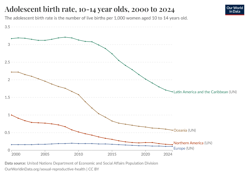 United Nations Department of Economic and Social Affairs Population Division – processed by Our World in Data. “Adolescent birth rate, 10-14 year olds” [dataset]. United Nations Department of Economic and Social Affairs Population Division, “Data from multiple sources” [original data]. Retrieved March 11, 2026 from https://gdocs-bespoke-component.owid.pages.dev/grapher/adolescent-fertility