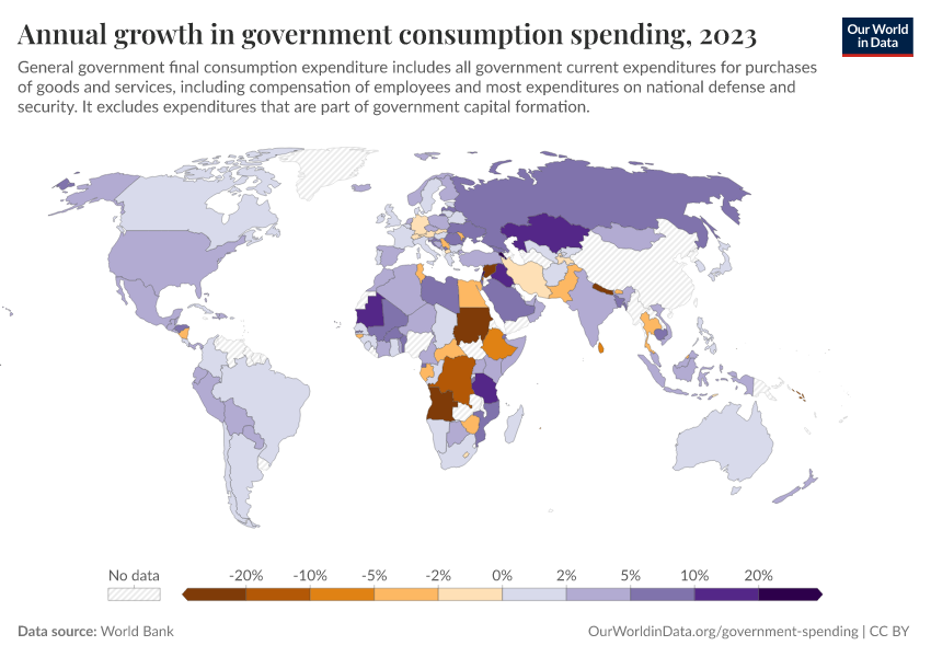 “Data Page: Annual growth in government consumption spending”. Our World in Data (2026). Data adapted from World Bank. Retrieved from https://gdocs-bespoke-component.owid.pages.dev/grapher/annual-growth-of-general-government-final-consumption-expenditure [online resource]How to cite this data