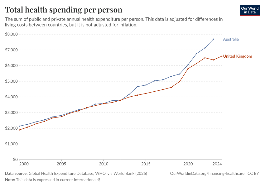 “Data Page: Total health spending per person”. Our World in Data (2026). Data adapted from Global Health Expenditure Database, WHO, via World Bank. Retrieved from https://gdocs-bespoke-component.owid.pages.dev/grapher/annual-healthcare-expenditure-per-capita [online resource]