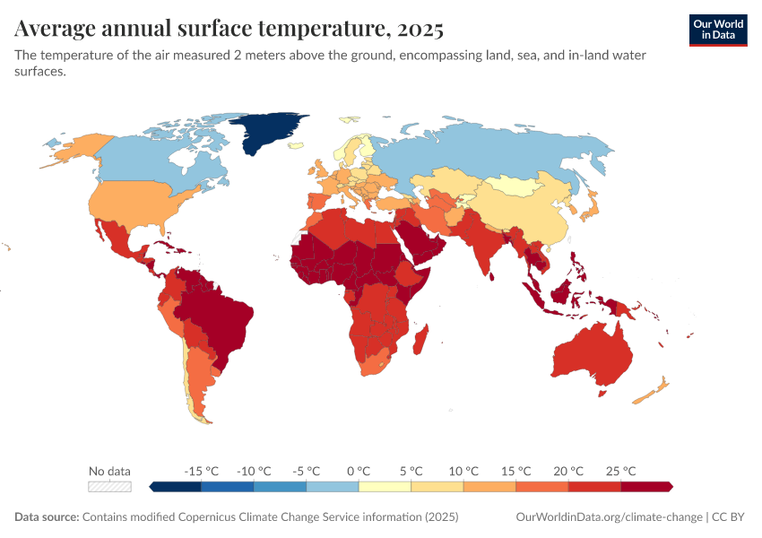 Contains modified Copernicus Climate Change Service information (2025) – with major processing by Our World in Data. “Average annual surface temperature” [dataset]. Contains modified Copernicus Climate Change Service information, “ERA5 monthly averaged data on single levels from 1940 to present 2” [original data]. Retrieved March 11, 2026 from https://gdocs-bespoke-component.owid.pages.dev/grapher/average-annual-surface-temperature