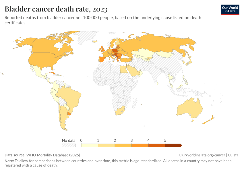 “Data Page: Bladder cancer death rate”, part of the following publication: Saloni Dattani, Fiona Spooner, Hannah Ritchie, and Max Roser (2023) - “Causes of Death”. Data adapted from WHO Mortality Database. Retrieved from https://gdocs-bespoke-component.owid.pages.dev/grapher/bladder-cancer-death-rate [online resource]How to cite this data