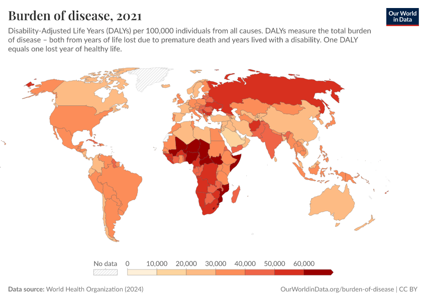 World Health Organization (2024) – with major processing by Our World in Data. “Burden of disease” [dataset]. World Health Organization, “Global Health Estimates” [original data]. Retrieved March 11, 2026 from https://gdocs-bespoke-component.owid.pages.dev/grapher/burden-of-disease-who