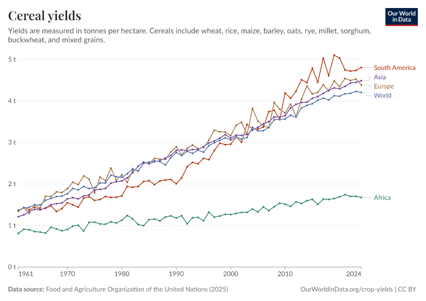 Food and Agriculture Organization of the United Nations (2025) – with major processing by Our World in Data. “Cereal yields – UN FAO” [dataset]. Food and Agriculture Organization of the United Nations, “Production: Crops and livestock products” [original data]. Retrieved March 11, 2026 from https://gdocs-bespoke-component.owid.pages.dev/grapher/cereal-yield