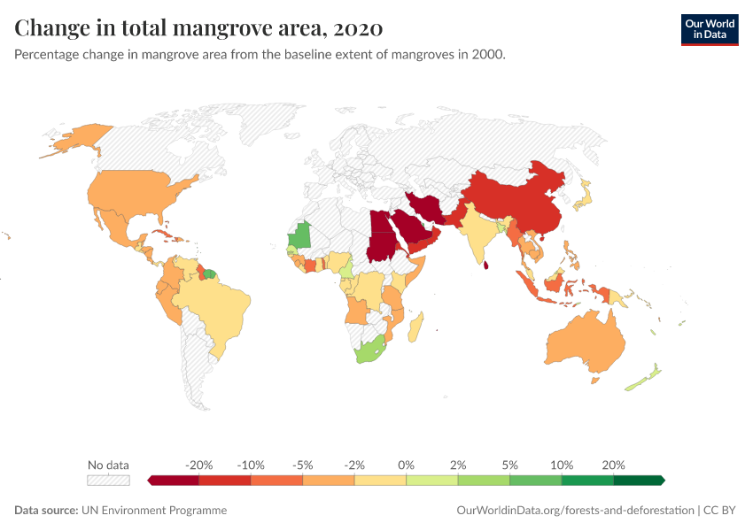 “Data Page: Change in total mangrove area”. Our World in Data (2026). Data adapted from UN Environment Programme. Retrieved from https://gdocs-bespoke-component.owid.pages.dev/grapher/change-in-total-mangrove-area [online resource]How to cite this data