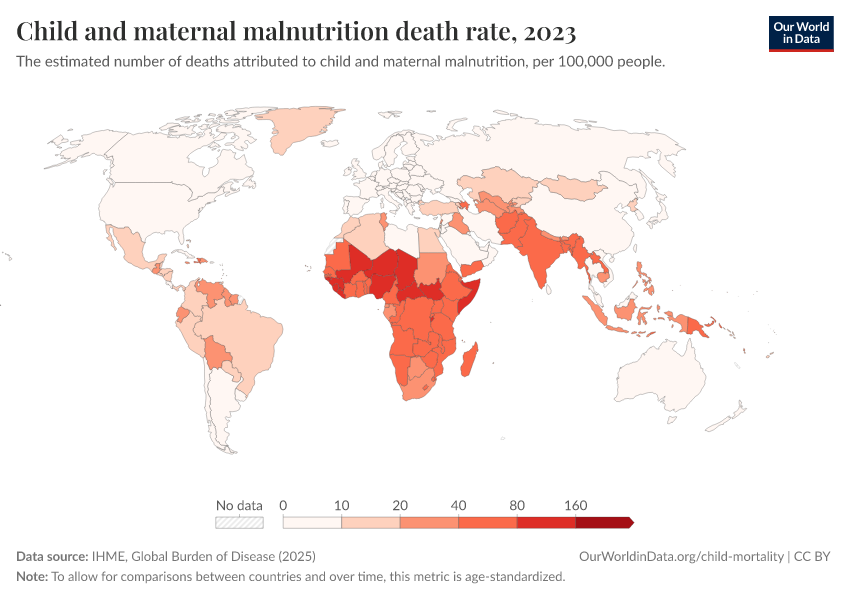 IHME, Global Burden of Disease (2025) – with major processing by Our World in Data. “Child and maternal malnutrition death rate” [dataset]. IHME, Global Burden of Disease, “Global Burden of Disease - Risk Factors - Deaths” [original data]. Retrieved March 11, 2026 from https://gdocs-bespoke-component.owid.pages.dev/grapher/child-and-maternal-malnutrition-death-rate
