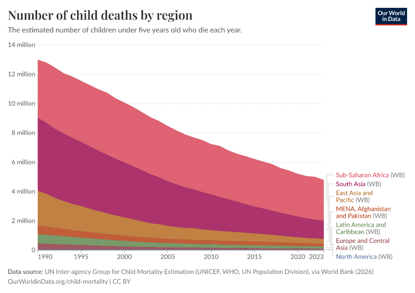 UN Inter-agency Group for Child Mortality Estimation (UNICEF, WHO, UN Population Division), via World Bank (2026) – processed by Our World in Data. “Number of child deaths by region” [dataset]. UN Inter-agency Group for Child Mortality Estimation (UNICEF, WHO, UN Population Division), via World Bank, “World Development Indicators 125” [original data]. Retrieved March 11, 2026 from https://gdocs-bespoke-component.owid.pages.dev/grapher/child-deaths-igme-data