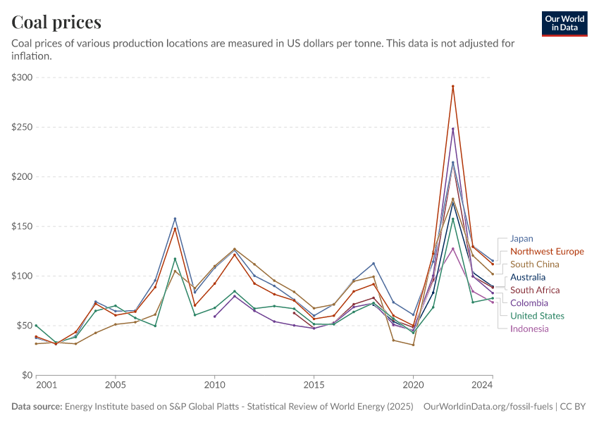 “Data Page: Coal prices”, part of the following publication: Hannah Ritchie, Pablo Rosado, and Max Roser (2023) - “Energy”. Data adapted from Energy Institute. Retrieved from https://gdocs-bespoke-component.owid.pages.dev/grapher/coal-prices [online resource]How to cite this data
