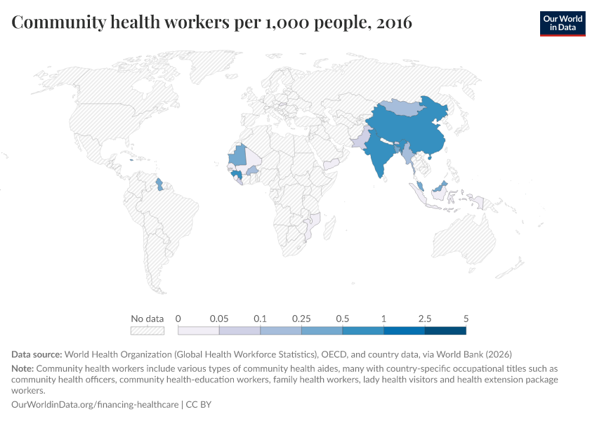 “Data Page: Community health workers per 1,000 people”. Our World in Data (2026). Data adapted from World Health Organization (Global Health Workforce Statistics), OECD, and country data, via World Bank. Retrieved from https://gdocs-bespoke-component.owid.pages.dev/grapher/community-health-workers [online resource]How to cite this data