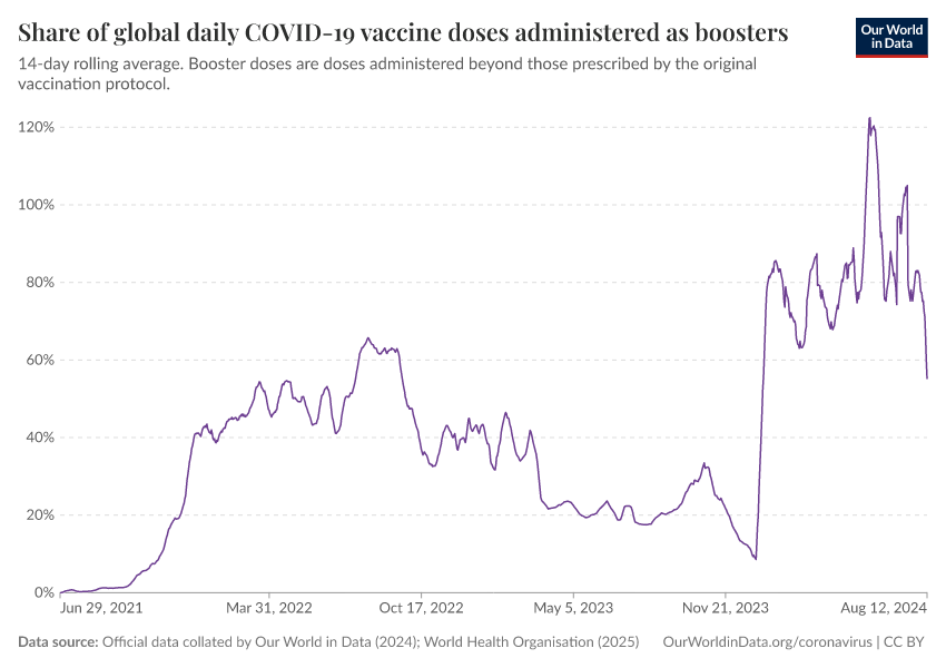 Official data collated by Our World in Data (2024); World Health Organisation (2025) – with major processing by Our World in Data. “Share of global daily COVID-19 vaccine doses administered as boosters” [dataset]. Official data collated by Our World in Data, “COVID-19, vaccinations”; World Health Organisation, “COVID-19, vaccinations (WHO)” [original data]. Retrieved March 11, 2026 from https://gdocs-bespoke-component.owid.pages.dev/grapher/covid-vaccine-share-boosters