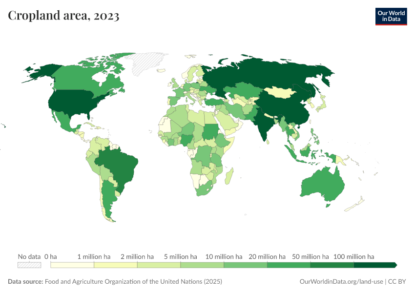 “Data Page: Cropland area”, part of the following publication: Hannah Ritchie, Pablo Rosado, and Max Roser (2023) - “Agricultural Production”. Data adapted from Food and Agriculture Organization of the United Nations. Retrieved from https://gdocs-bespoke-component.owid.pages.dev/grapher/cropland-area [online resource]How to cite this data