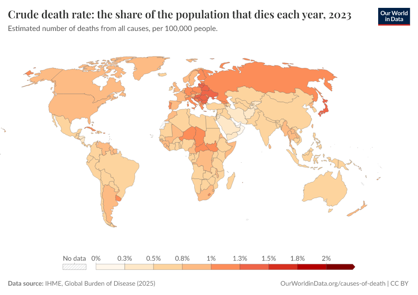IHME, Global Burden of Disease (2025) – with major processing by Our World in Data. “Crude death rate: the share of the population that dies each year” [dataset]. IHME, Global Burden of Disease, “Global Burden of Disease - Deaths” [original data]. Retrieved March 11, 2026 from https://gdocs-bespoke-component.owid.pages.dev/grapher/crude-death-rate-the-share-of-the-population-that-dies-each-year-gbd