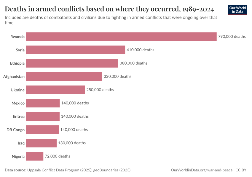 Uppsala Conflict Data Program (2023); Natural Earth (2022) – processed by Our World in Data. “Deaths in armed conflicts based on where they occurred, 1989-2024” [dataset]. Uppsala Conflict Data Program, “Georeferenced Event Dataset (cumulative)”; Natural Earth, “Large scale data (1:10m Cultural Vectors), Admin 0 Countries 5.1.1” [original data]. Retrieved March 11, 2026 from https://gdocs-bespoke-component.owid.pages.dev/grapher/cumulative-deaths-in-armed-conflicts