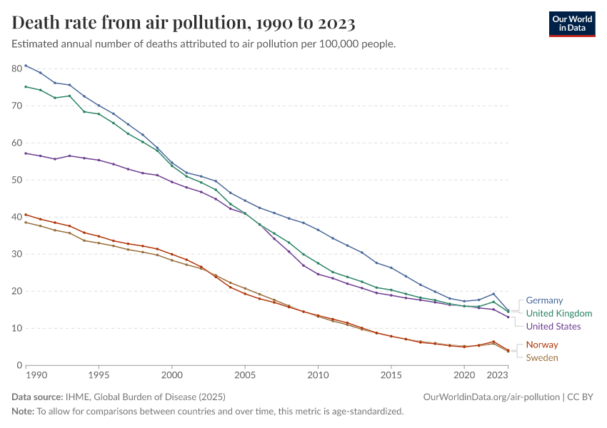 IHME, Global Burden of Disease (2025) – with major processing by Our World in Data. “Death rate from air pollution” [dataset]. IHME, Global Burden of Disease, “Global Burden of Disease - Risk Factors - Deaths” [original data]. Retrieved March 11, 2026 from https://gdocs-bespoke-component.owid.pages.dev/grapher/death-rate-from-air-pollution-per-100000