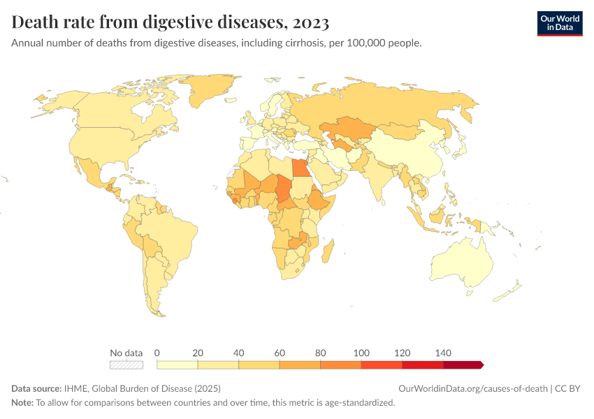 IHME, Global Burden of Disease (2025) – with major processing by Our World in Data. “Death rate from digestive diseases” [dataset]. IHME, Global Burden of Disease, “Global Burden of Disease - Deaths” [original data]. Retrieved March 11, 2026 from https://gdocs-bespoke-component.owid.pages.dev/grapher/death-rate-from-digestive-diseases
