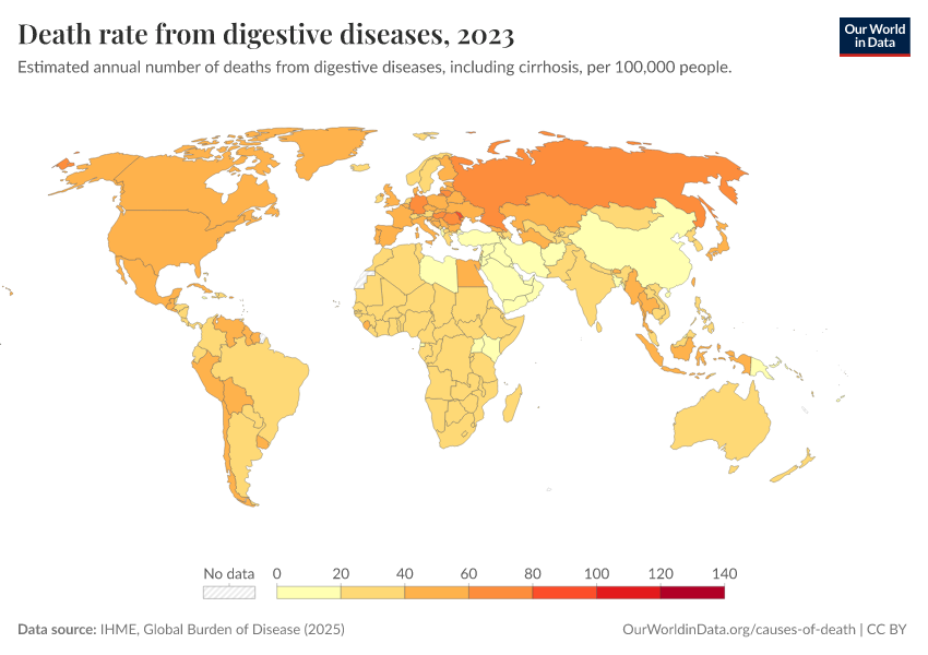 IHME, Global Burden of Disease (2025) – with major processing by Our World in Data. “Death rate from digestive diseases” [dataset]. IHME, Global Burden of Disease, “Global Burden of Disease - Deaths” [original data]. Retrieved March 11, 2026 from https://gdocs-bespoke-component.owid.pages.dev/grapher/death-rate-from-digestive-diseases-gbd