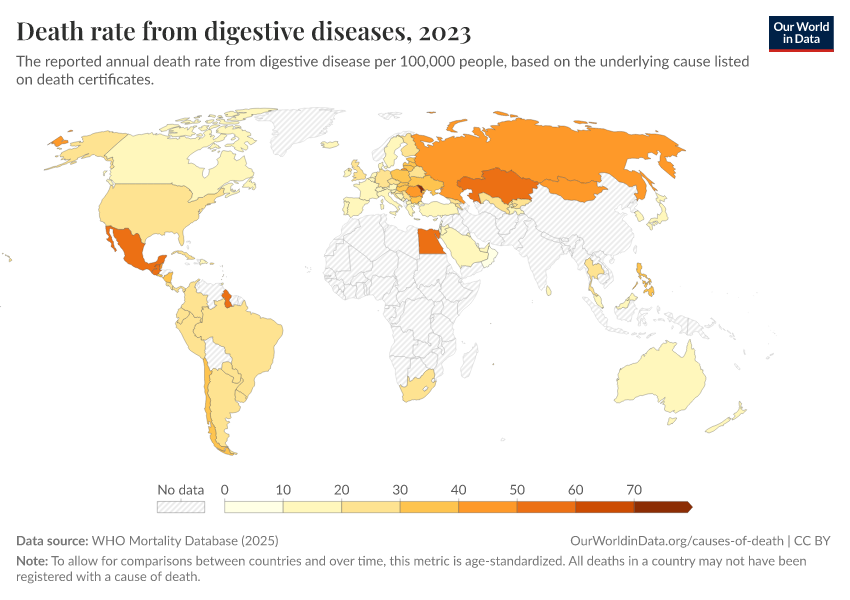 “Data Page: Death rate from digestive diseases”, part of the following publication: Saloni Dattani, Fiona Spooner, Hannah Ritchie, and Max Roser (2023) - “Causes of Death”. Data adapted from WHO Mortality Database. Retrieved from https://gdocs-bespoke-component.owid.pages.dev/grapher/death-rate-from-digestive-diseases-who-mdb [online resource]How to cite this data