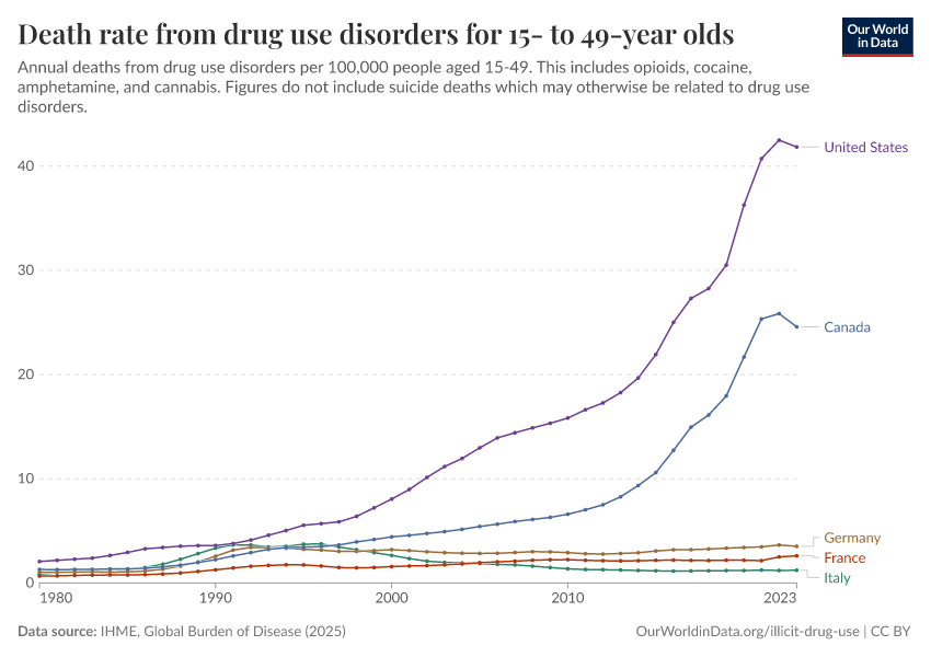 IHME, Global Burden of Disease (2025) – with major processing by Our World in Data. “Death rate from drug use disorders for 15- to 49-year olds” [dataset]. IHME, Global Burden of Disease, “Global Burden of Disease - Deaths” [original data]. Retrieved March 11, 2026 from https://gdocs-bespoke-component.owid.pages.dev/grapher/death-rate-from-drug-use-disorders-for-15--to-49-year-olds