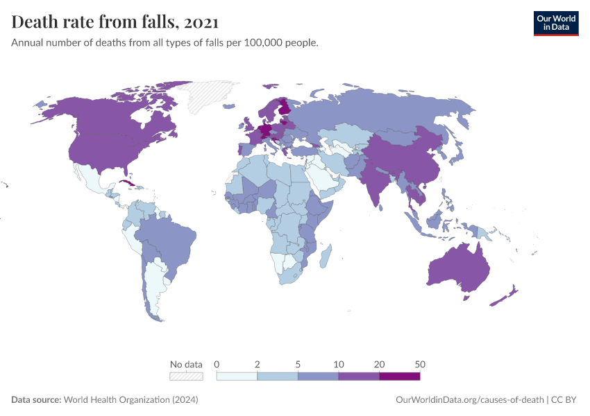 World Health Organization (2024) – with major processing by Our World in Data. “Death rate from falls” [dataset]. World Health Organization, “Global Health Estimates” [original data]. Retrieved March 11, 2026 from https://gdocs-bespoke-component.owid.pages.dev/grapher/death-rate-from-falls