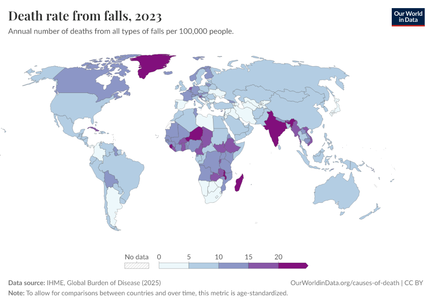IHME, Global Burden of Disease (2025) – with major processing by Our World in Data. “Death rate from falls” [dataset]. IHME, Global Burden of Disease, “Global Burden of Disease - Deaths” [original data]. Retrieved March 11, 2026 from https://gdocs-bespoke-component.owid.pages.dev/grapher/death-rate-from-falls-gbd