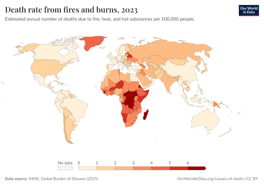 IHME, Global Burden of Disease (2025) – with major processing by Our World in Data. “Death rate from fires and burns” [dataset]. IHME, Global Burden of Disease, “Global Burden of Disease - Deaths” [original data]. Retrieved March 11, 2026 from https://gdocs-bespoke-component.owid.pages.dev/grapher/death-rate-from-fires-and-burns-ihme