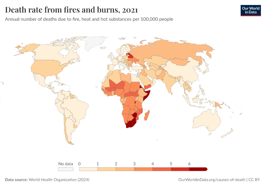 World Health Organization (2024) – with major processing by Our World in Data. “Death rate from fires and burns” [dataset]. World Health Organization, “Global Health Estimates” [original data]. Retrieved March 11, 2026 from https://gdocs-bespoke-component.owid.pages.dev/grapher/death-rate-from-fires-and-burns-who