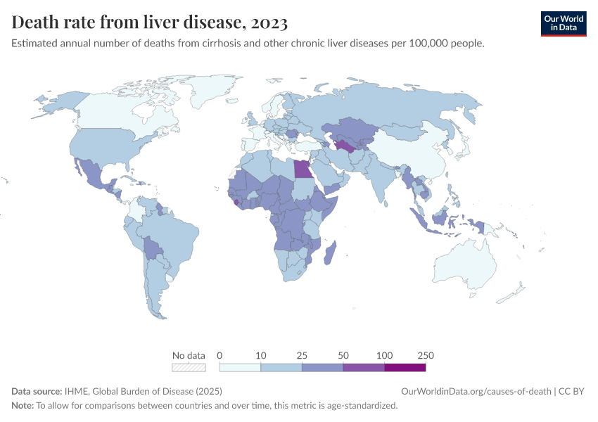IHME, Global Burden of Disease (2025) – with major processing by Our World in Data. “Death rate from liver disease” [dataset]. IHME, Global Burden of Disease, “Global Burden of Disease - Deaths” [original data]. Retrieved March 11, 2026 from https://gdocs-bespoke-component.owid.pages.dev/grapher/death-rate-from-liver-disease