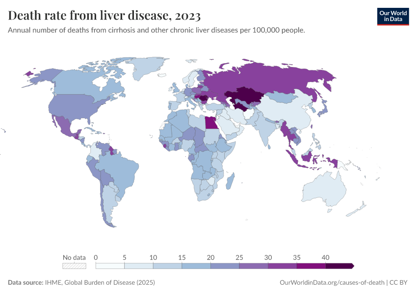 IHME, Global Burden of Disease (2025) – with major processing by Our World in Data. “Death rate from liver disease” [dataset]. IHME, Global Burden of Disease, “Global Burden of Disease - Deaths” [original data]. Retrieved March 11, 2026 from https://gdocs-bespoke-component.owid.pages.dev/grapher/death-rate-from-liver-disease-gbd