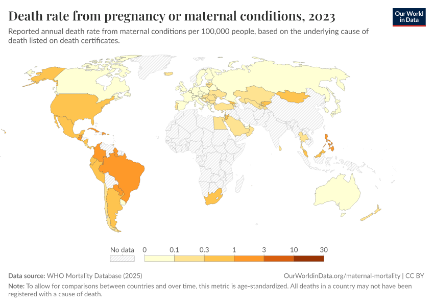 WHO Mortality Database (2025) – with minor processing by Our World in Data. “Death rate from pregnancy or maternal conditions” [dataset]. WHO Mortality Database, “WHO Mortality Database” [original data]. Retrieved March 11, 2026 from https://gdocs-bespoke-component.owid.pages.dev/grapher/death-rate-from-maternal-disorders