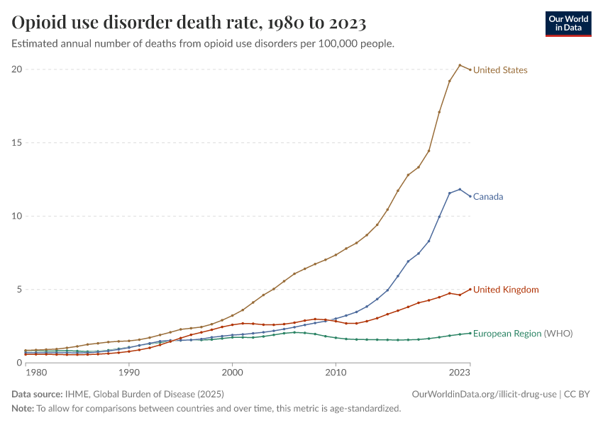 IHME, Global Burden of Disease (2025) – with major processing by Our World in Data. “Opioid use disorder death rate” [dataset]. IHME, Global Burden of Disease, “Global Burden of Disease - Deaths” [original data]. Retrieved March 11, 2026 from https://gdocs-bespoke-component.owid.pages.dev/grapher/death-rate-from-opioid-use