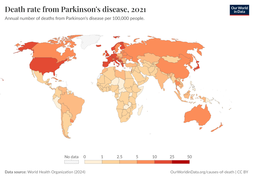 World Health Organization (2024) – with major processing by Our World in Data. “Death rate from Parkinson's disease” [dataset]. World Health Organization, “Global Health Estimates” [original data]. Retrieved March 11, 2026 from https://gdocs-bespoke-component.owid.pages.dev/grapher/death-rate-from-parkinsons-disease-ghe