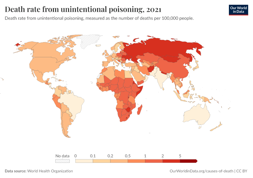 “Data Page: Death rate from unintentional poisoning”. Our World in Data (2026). Data adapted from World Health Organization. Retrieved from https://gdocs-bespoke-component.owid.pages.dev/grapher/death-rate-from-poisonings [online resource]How to cite this data