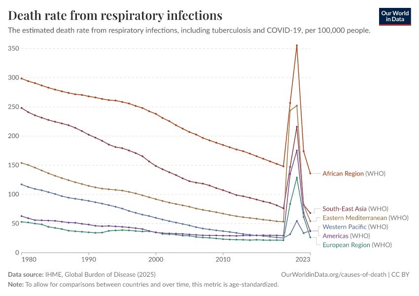 IHME, Global Burden of Disease (2025) – with major processing by Our World in Data. “Death rate from respiratory infections” [dataset]. IHME, Global Burden of Disease, “Global Burden of Disease - Deaths” [original data]. Retrieved March 11, 2026 from https://gdocs-bespoke-component.owid.pages.dev/grapher/death-rate-from-respiratory-infections