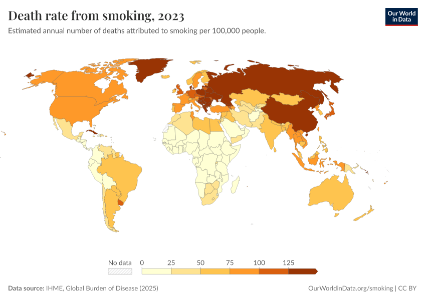 IHME, Global Burden of Disease (2025) – with major processing by Our World in Data. “Death rate from smoking” [dataset]. IHME, Global Burden of Disease, “Global Burden of Disease - Risk Factors - Deaths” [original data]. Retrieved March 11, 2026 from https://gdocs-bespoke-component.owid.pages.dev/grapher/death-rate-from-smoking