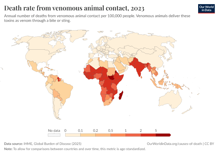 IHME, Global Burden of Disease (2025) – with major processing by Our World in Data. “Death rate from venomous animal contact” [dataset]. IHME, Global Burden of Disease, “Global Burden of Disease - Deaths” [original data]. Retrieved March 11, 2026 from https://gdocs-bespoke-component.owid.pages.dev/grapher/death-rate-from-venomous-animal