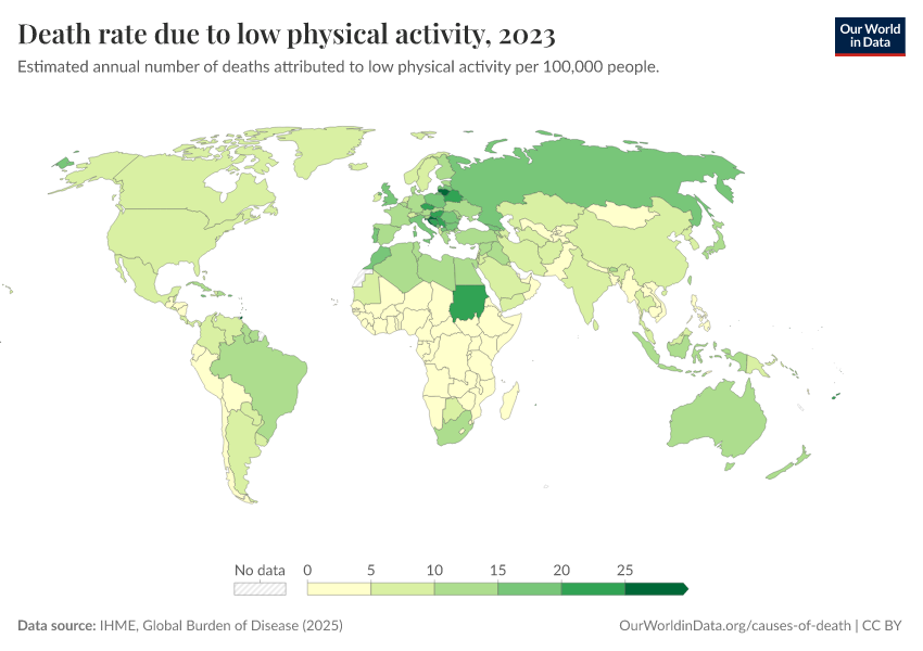IHME, Global Burden of Disease (2025) – with major processing by Our World in Data. “Death rate due to low physical activity” [dataset]. IHME, Global Burden of Disease, “Global Burden of Disease - Risk Factors - Deaths” [original data]. Retrieved March 11, 2026 from https://gdocs-bespoke-component.owid.pages.dev/grapher/death-rates-due-to-low-physical-activity-gbd