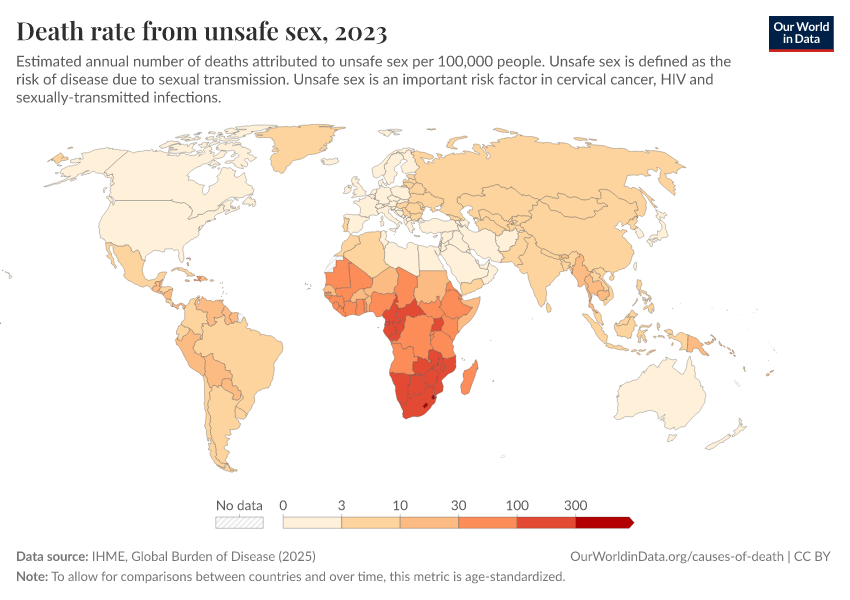 IHME, Global Burden of Disease (2025) – with major processing by Our World in Data. “Death rate from unsafe sex” [dataset]. IHME, Global Burden of Disease, “Global Burden of Disease - Risk Factors - Deaths” [original data]. Retrieved March 11, 2026 from https://gdocs-bespoke-component.owid.pages.dev/grapher/death-rates-from-unsafe-sex