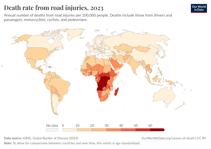 IHME, Global Burden of Disease (2025) – with major processing by Our World in Data. “Death rate from road injuries” [dataset]. IHME, Global Burden of Disease, “Global Burden of Disease - Deaths” [original data]. Retrieved March 11, 2026 from https://gdocs-bespoke-component.owid.pages.dev/grapher/death-rates-road-incidents