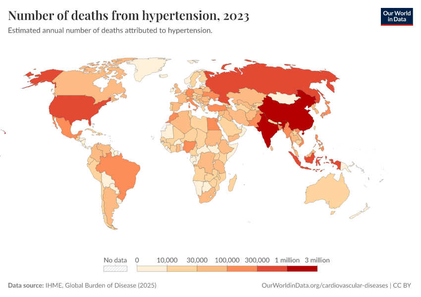 IHME, Global Burden of Disease (2025) – with major processing by Our World in Data. “Number of deaths from hypertension” [dataset]. IHME, Global Burden of Disease, “Global Burden of Disease - Risk Factors - Deaths” [original data]. Retrieved March 11, 2026 from https://gdocs-bespoke-component.owid.pages.dev/grapher/deaths-due-to-high-blood-pressure