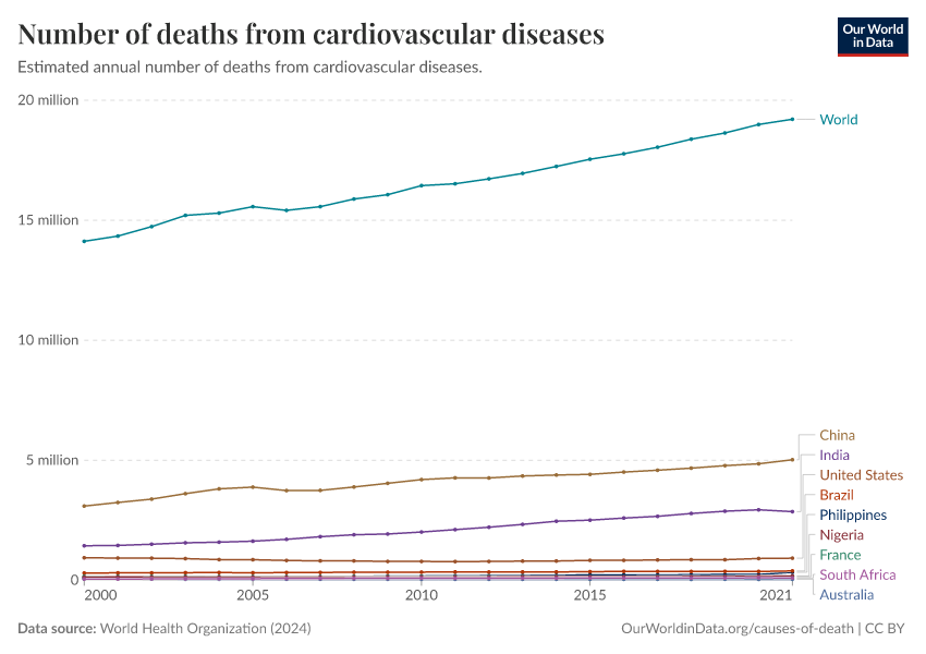 World Health Organization (2024) – with major processing by Our World in Data. “Number of deaths from cardiovascular diseases” [dataset]. World Health Organization, “Global Health Estimates” [original data]. Retrieved March 11, 2026 from https://gdocs-bespoke-component.owid.pages.dev/grapher/deaths-from-cardiovascular-disease-ghe