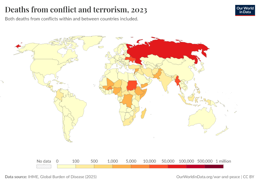 IHME, Global Burden of Disease (2025) – with major processing by Our World in Data. “Deaths from conflict and terrorism” [dataset]. IHME, Global Burden of Disease, “Global Burden of Disease - Deaths” [original data]. Retrieved March 11, 2026 from https://gdocs-bespoke-component.owid.pages.dev/grapher/deaths-from-conflict-and-terrorism