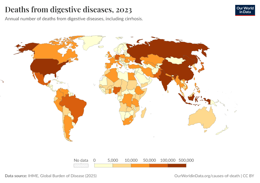 IHME, Global Burden of Disease (2025) – with major processing by Our World in Data. “Deaths from digestive diseases” [dataset]. IHME, Global Burden of Disease, “Global Burden of Disease - Deaths” [original data]. Retrieved March 11, 2026 from https://gdocs-bespoke-component.owid.pages.dev/grapher/deaths-from-digestive-diseases