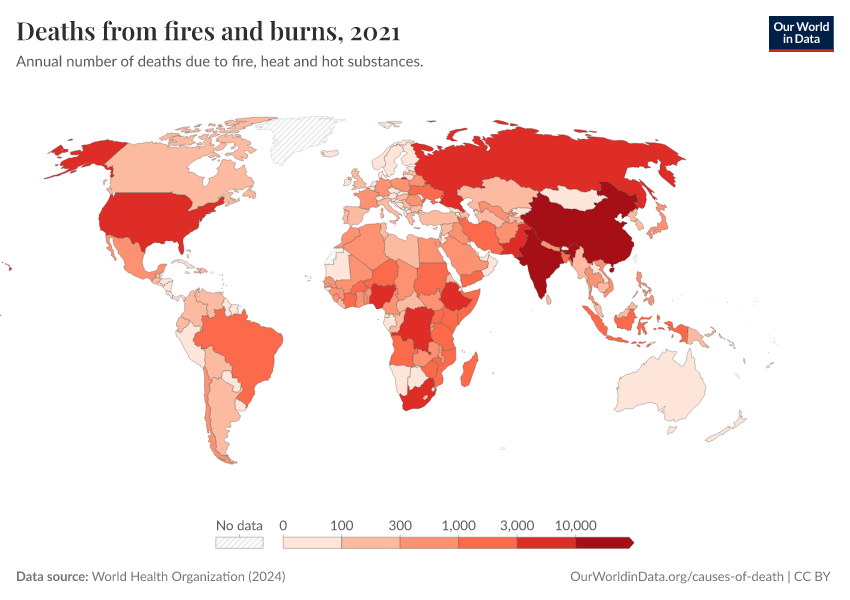 World Health Organization (2024) – with major processing by Our World in Data. “Deaths from fires and burns” [dataset]. World Health Organization, “Global Health Estimates” [original data]. Retrieved March 11, 2026 from https://gdocs-bespoke-component.owid.pages.dev/grapher/deaths-from-fires-and-burns-who