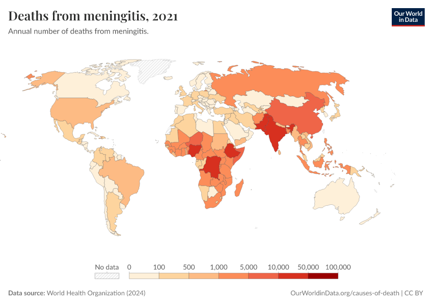 World Health Organization (2024) – with major processing by Our World in Data. “Deaths from meningitis” [dataset]. World Health Organization, “Global Health Estimates” [original data]. Retrieved March 11, 2026 from https://gdocs-bespoke-component.owid.pages.dev/grapher/deaths-from-meningitis-ghe