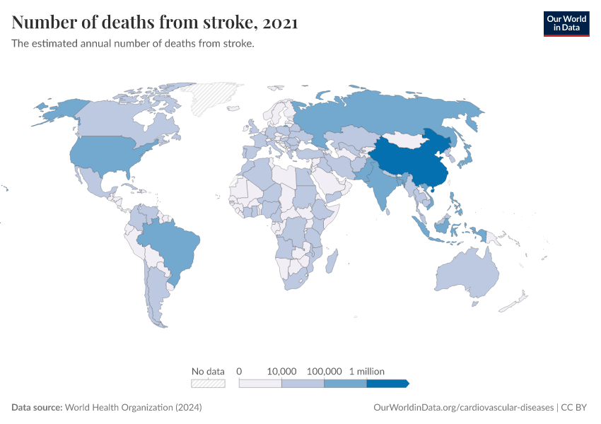 World Health Organization (2024) – with major processing by Our World in Data. “Number of deaths from stroke” [dataset]. World Health Organization, “Global Health Estimates” [original data]. Retrieved March 11, 2026 from https://gdocs-bespoke-component.owid.pages.dev/grapher/deaths-from-strokes-ghe
