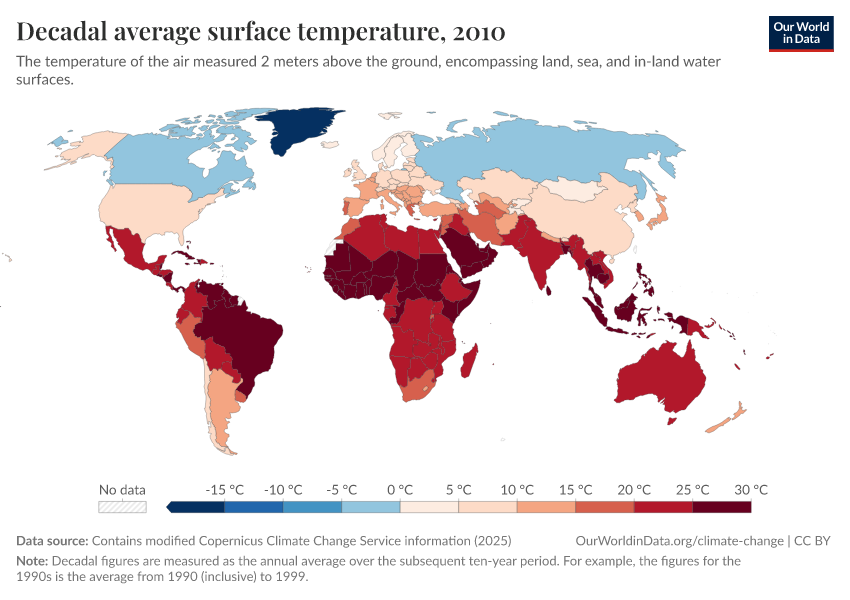 “Data Page: Decadal average surface temperature”, part of the following publication: Hannah Ritchie, Pablo Rosado, and Veronika Samborska (2024) - “Climate Change”. Data adapted from Contains modified Copernicus Climate Change Service information. Retrieved from https://gdocs-bespoke-component.owid.pages.dev/grapher/decadal-average-surface-temperature [online resource]How to cite this data